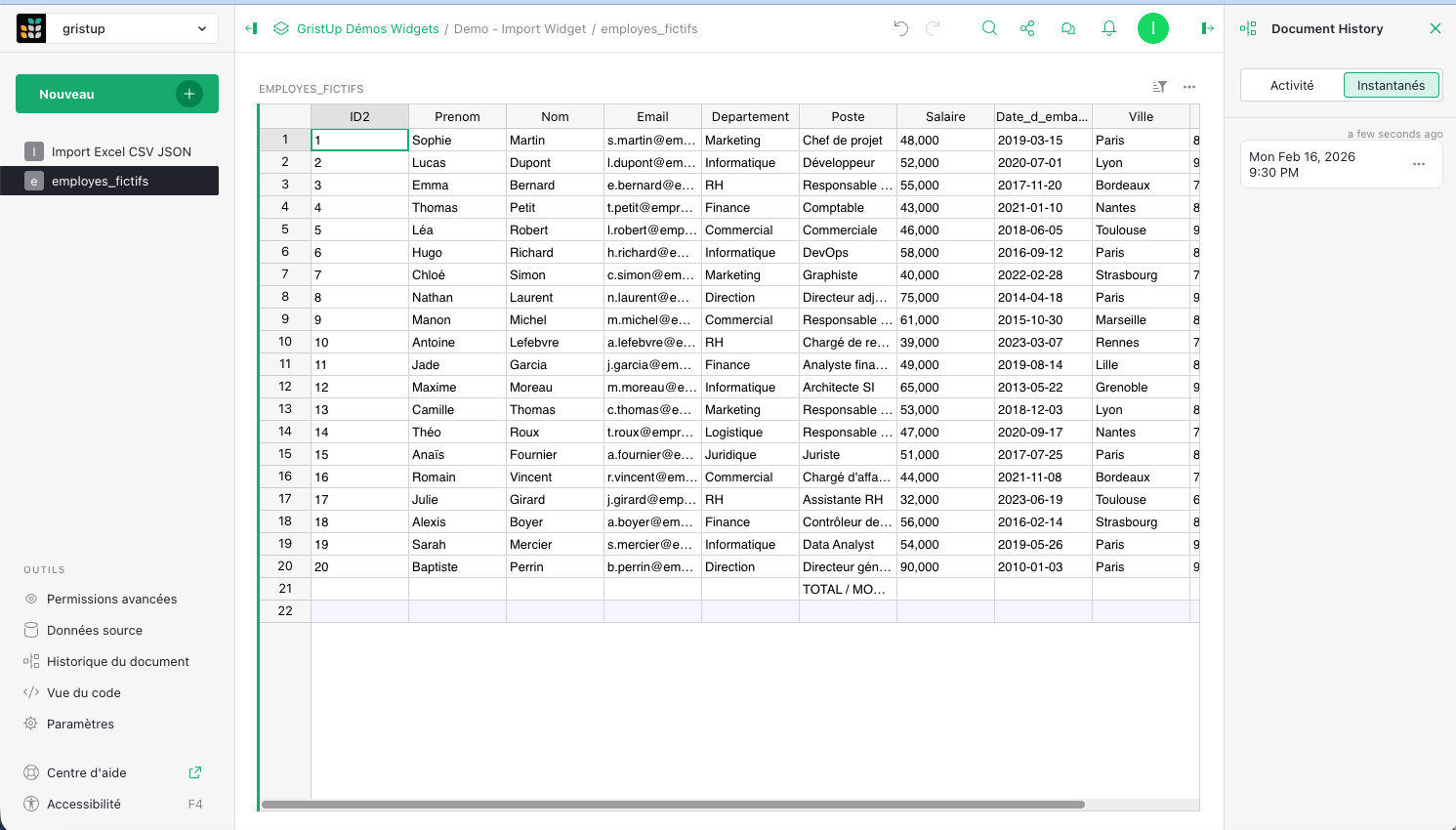 Fusionnez deux tables Grist en une seule, avec toutes les colonnes et formules préservées. Idéal pour consolider des données séparées ou créer des vues unifiées. Supporte les colonnes Reference, les types Numeric/Date/Text, et recrée automatiquement les formules Python.