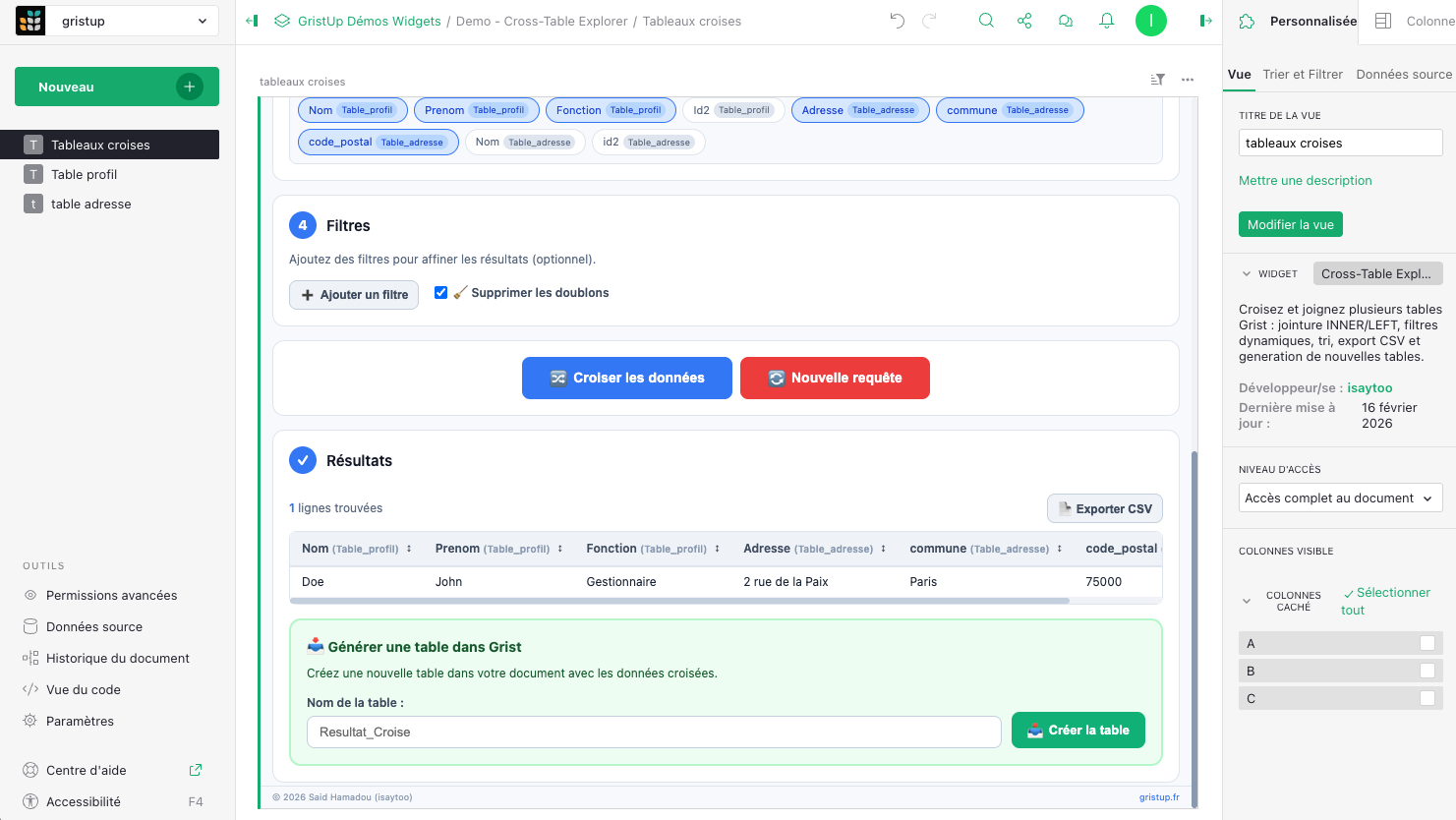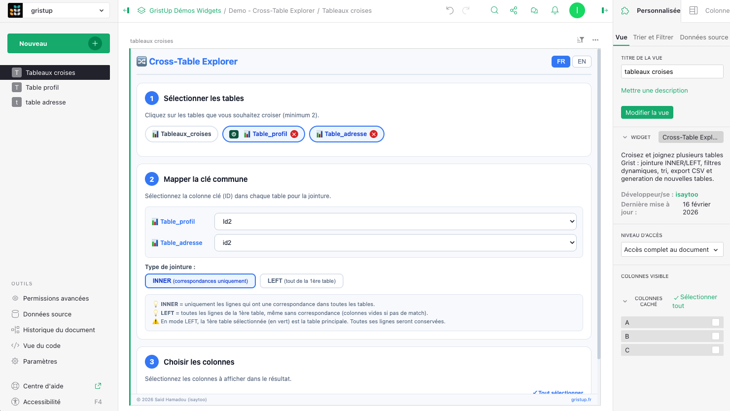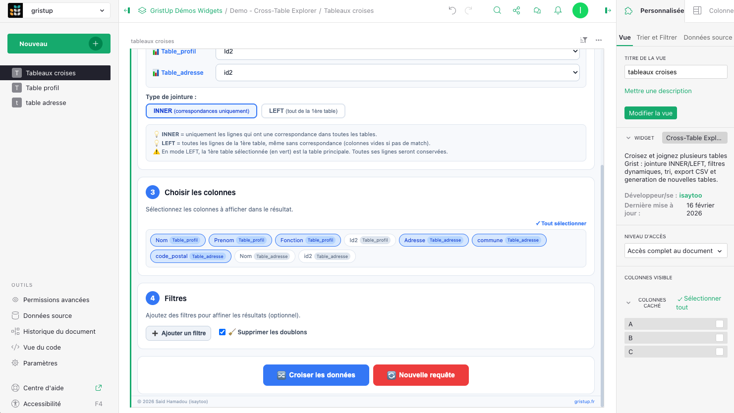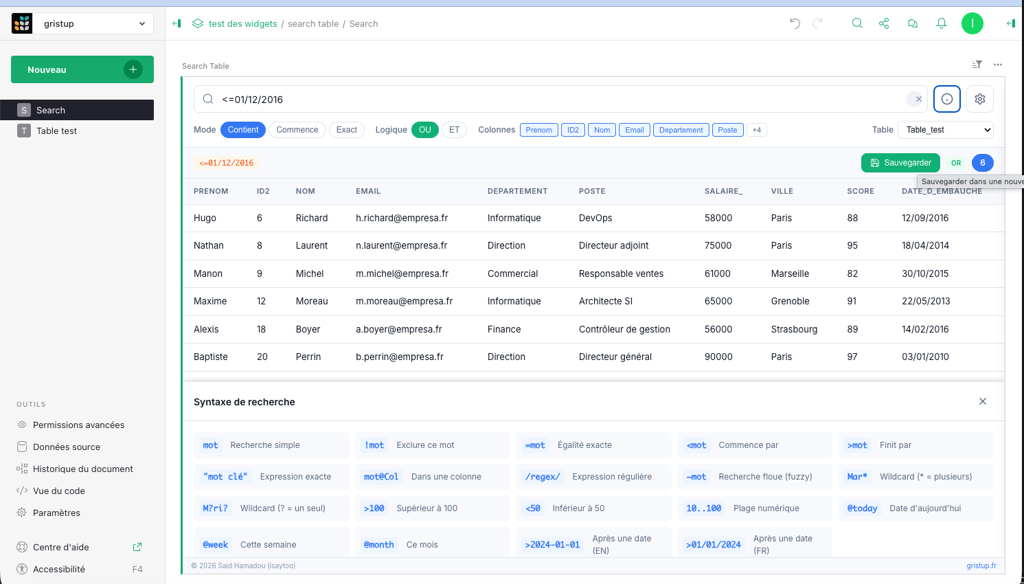 Widget de recherche avancée pour Grist. Recherche multi-colonnes avec modes Contient/Commence/Exact, logique OU/ET, sélection de colonnes, et possibilité de rechercher dans n'importe quelle table du document. Interface moderne et intuitive.