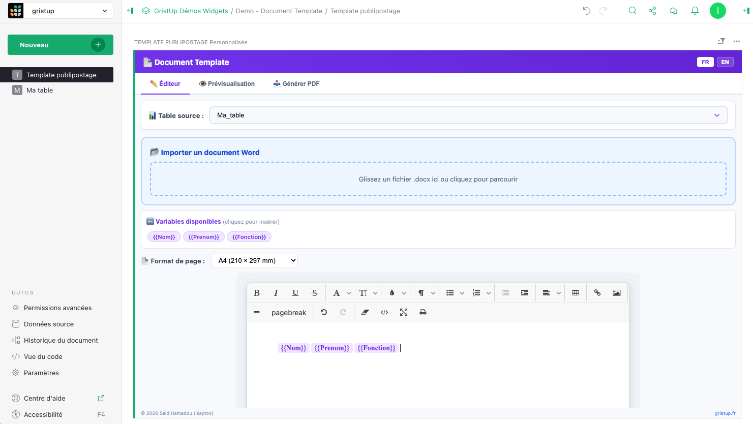 Editeur WYSIWYG avec mail merge : inserez des variables {{Nom}}, importez un fichier Word, previsualisez et generez des PDF pour chaque enregistrement.